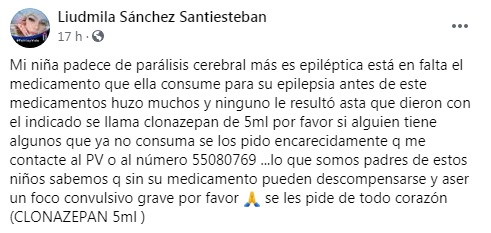 “Mi niña padece de parálisis cerebral más es epiléptica está en falta el medicamento que ella consume para su epilepsia antes de este medicamentos usó muchos y ninguno le resultó hasta que dieron con el indicado se llama clonazepan de 5ml, por favor si alguien tiene algunos que ya no consuma se los pido encarecidamente que me contacte al privado o al número 55080769. Los que somos padres de estos niños sabemos que sin su medicamento pueden descompensarse y hacer un foco convulsivo grave por favor, se les pide de todo corazón (CLONAZEPAN 5ml)”, explica Sánchez Santiesteban.