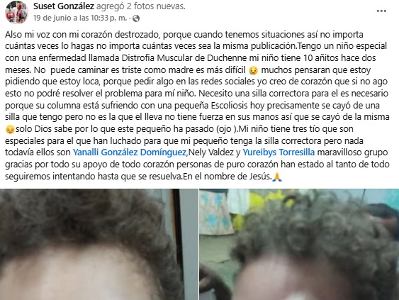 En su publicación en Facebook, González expresó con angustia: “Es necesario que mi hijo tenga la silla correcta, su salud depende de ello”.