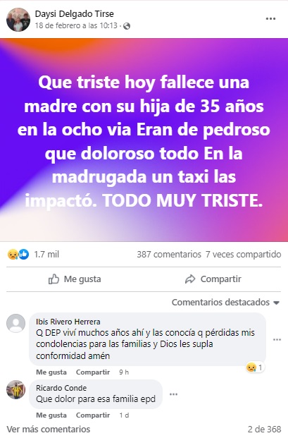 “Que triste, hoy fallece una madre con su hija de 35 años en la ocho vía. Eran de Pedroso, qué doloroso todo. En la madrugada un taxi las impactó. Todo muy triste”, indicó Daysi Delgado Tirse, miembro del grupo de Facebook Accidentes Buses & Camiones por más experiencia y menos víctimas.