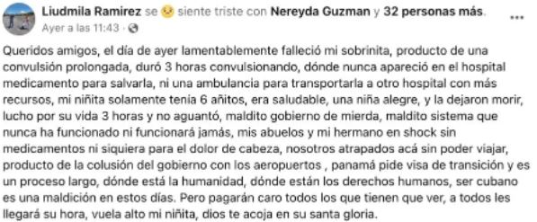 “Mi niñita solamente tenía 6 añitos. Era saludable. Una niña alegre, y la dejaron morir. Lucho por su vida 3 horas y no aguantó. Maldito gobierno de mierda, maldito sistema que nunca ha funcionado ni funcionará jamás. Mis abuelos y mi hermano en shock sin medicamentos ni siquiera para el dolor de cabeza. Nosotros atrapados acá sin poder viajar (…) Vuela alto, mi niñita. Dios te acoja en su santa gloria”.