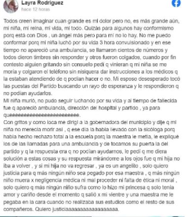 “Solo quiero justicia para que más ningún niño sea pegado por esa maestra. Que más ningún niño muera por negligencia médica, ni mal proceder, ni falta de ética ni moral (…) Quiero justiciaaaaaa”, finalizó la madre.