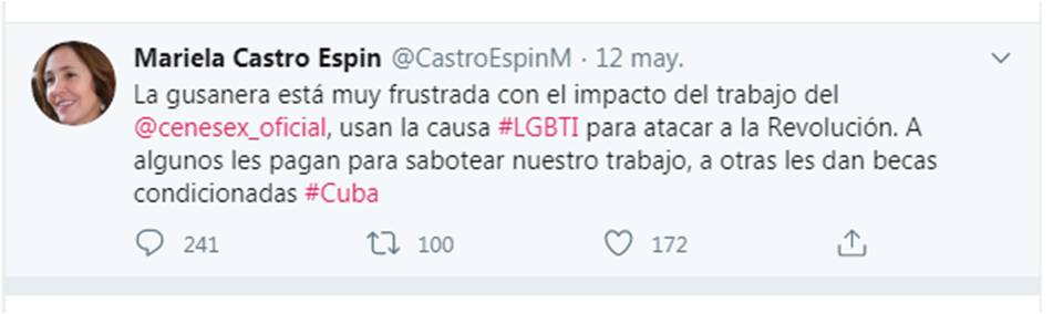 “La gusanera está muy frustrada con el impacto del trabajo del CENESEX, usan la causa #LGBTI para atacar a la revolución”, escribió en su cuenta en Twitter.