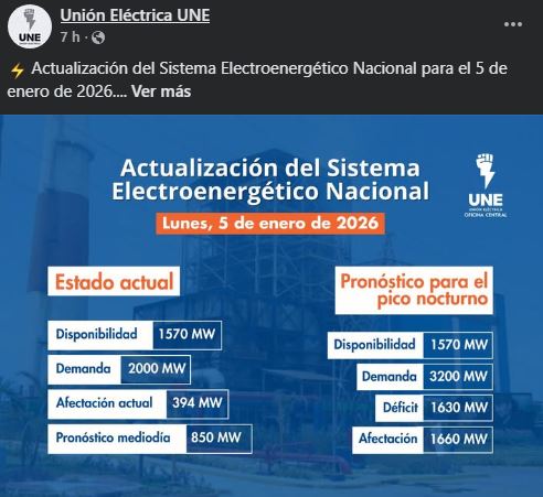 El impacto de esta escasez se refleja directamente en los apagones diarios. De acuerdo con el pronóstico de la Unión Eléctrica para este 5 de enero, el Sistema Eléctrico Nacional enfrentaría un déficit de hasta 1.660 MW durante el horario de mayor consumo.