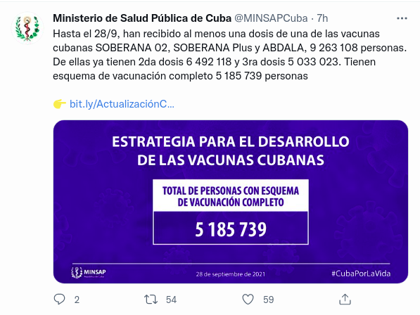 El Ministerio de Salud Pública (MINSAP) anunció que al cierre de este 28 de septiembre más de 5 millones de cubanos han recibido al menos tres dosis de los candidatos vacunales contra el COVID-19 desarrollados en Cuba, que aún no han sido avalados por la Organización Mundial de la Salud (OMS).