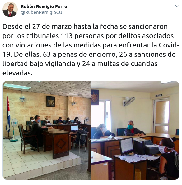 “Desde el 27 de marzo hasta la fecha se sancionaron por los tribunales 113 personas por delitos asociados con violaciones de las medidas para enfrentar la Covid-19. De ellas, 63 a penas de encierro, 26 a sanciones de libertad bajo vigilancia y 24 a multas de cuantías elevadas”, reportó el funcionario, quien no especificó la duración de las condenas ni la cuantía de las multas.