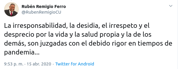 “La irresponsabilidad, la desidia, el irrespeto y el desprecio por la vida y la salud propia y la de los demás, son juzgadas con el debido rigor en tiempos de pandemia”, agregó Remigio.