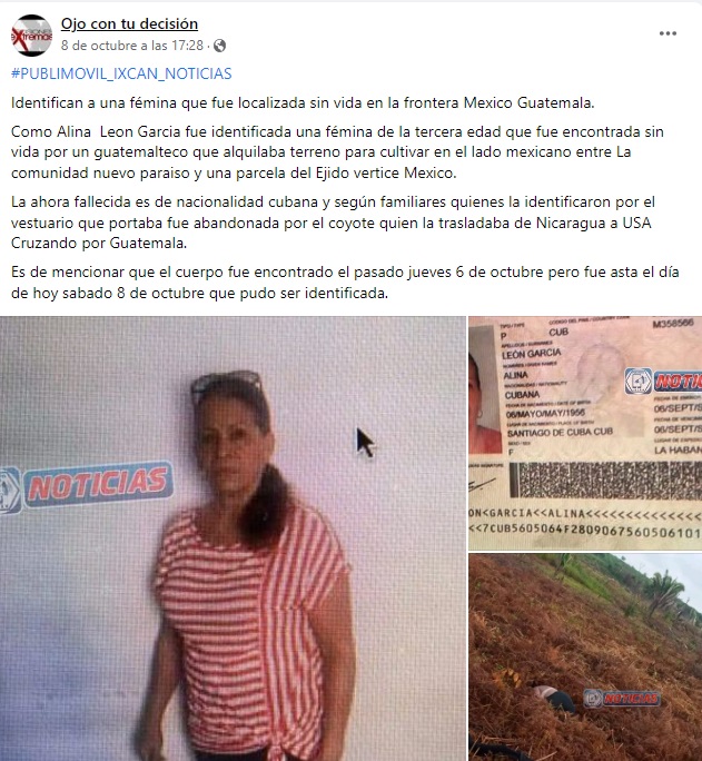La página de Facebook ‘Ojo con tu decisión’ indicó que el cuerpo de la cubana fue encontrado por un guatemalteco que alquila terreno para cultivar del lado mexicano, entre la comunidad de Nuevo Paraíso y una parcela del ejido Vértice.