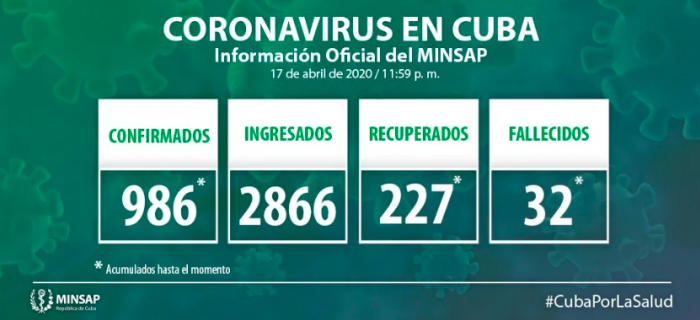 El Ministerio de Salud Pública de Cuba confirmó este sábado, 18 de abril, la existencia de 63 nuevos casos de coronavirus en el país y una nueva muerte. Con esta actualización, se eleva a 986 el total de pacientes infectados y a 31 el número de decesos desde el inicio de la pandemia en la Isla.