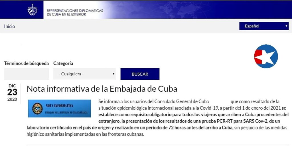 “A partir del 1 de enero de 2021, todo viajero que llegue a Cuba procedente del extranjero debe presentar los resultados de una prueba PCR-RT para SARS Cov-2 de un laboratorio certificado del país de origen de su viaje, realizada en el periodo de 72 horas anteriores a su llegada a Cuba”.