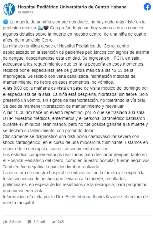 De acuerdo con un comunicado compartido por el Hospital Pediátrico Universitario de Centro Habana, perteneciente al Ministerio de Salud Pública (Minsap), la menor era residente en el municipio Cerro, y había sido ingresada con un diagnóstico preliminar de dengue que fue descartado poco después.