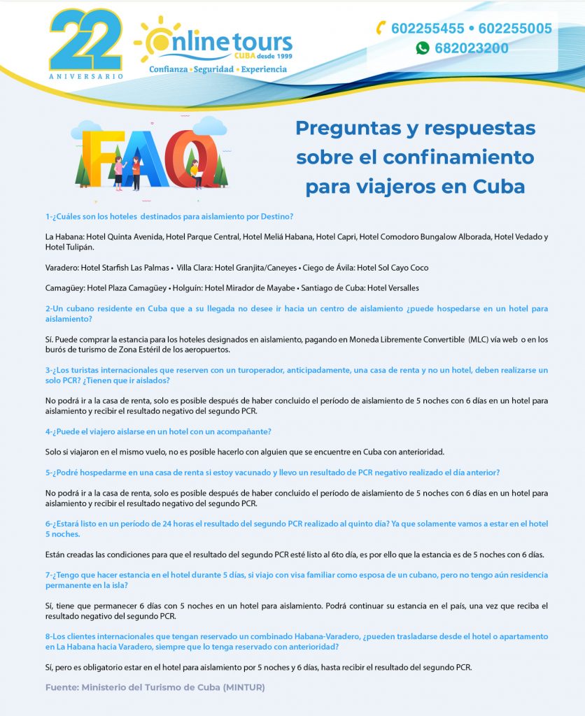 La agencia de viajes Online Tours compartió a través de sus redes sociales una nota aclaratoria del Ministerio del Turismo en Cuba (MINTUR) a propósito del confinamiento que deben cumplir los viajeros internacionales que arriben a la isla por la pandemia del Covid-19.
