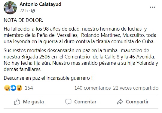 “Sus restos mortales descansarán en paz en la tumba- mausoleo de nuestra Brigada 2506 en el Cementerio de la Calle 8 y la 46 Avenida. No hay fecha fija aún. Nuestro mas sentido pésame a su hija Yolanda y demás familiares”, informó el santiaguero Antonio Calatayud en su perfil de Facebook.