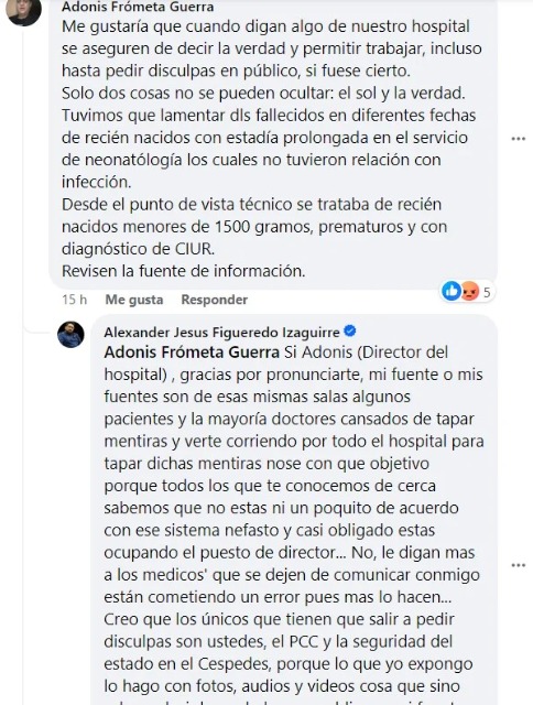 La publicación generó miles de reacciones y comentarios, incluyendo uno del director del hospital en cuestión, Adonis Frómeta Guerra, quien negó la acusación de Figueredo e incluso le exigió pedir disculpas en público.