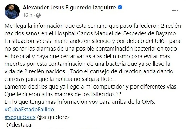 El médico cubano Alexander Jesús Figueredo Izaguirre denunció la muerte de dos bebés recién nacidos en el Hospital Carlos Manuel de Céspedes, en la provincia de Bayamo.
