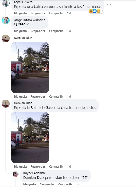 “Buenas tardes, soy bombero y participé ahí. Lo que sucedió fue una explosión producto de una concentración de gas. Una persona se encontraba dentro, era una mujer. La misma fue trasladada para el hospital con quemaduras graves”, se lee en el comentario hecho por Pérez.