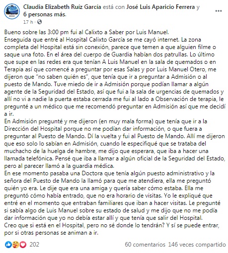Claudia Ruíz García, productora cubana, activista y amiga del artista Luis Manuel Otero Alcántara contó a través de su red social Facebook que se atrevió a acercarse hasta el hospital Calixto García de La Habana para conocer sobre el estado de salud de Luis Manuel Otero y le dijeron que debía retirarse del lugar y se negaron a darle información.