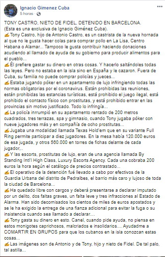 El activista cubano Ignacio Giménez, quien acostumbra a compartir noticias reveladoras del régimen cubano desde su perfil de Facebook, ahora asegura que el nieto de Fidel, enfrenta cargos por violar la cuarentena en España.