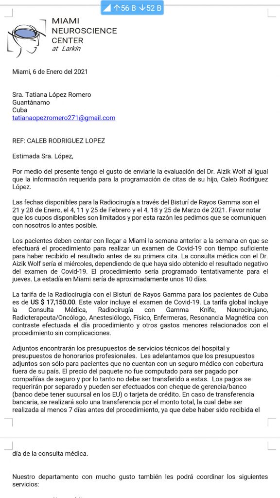 El presupuesto para operar al pequeño Caleb incluye todo el tratamiento médico en la clínica especializada de Miami. Sin embargo, los gastos de traslado y estadía deberá cubrirlos López Romero, quien también es madre de una niña, razón por la que se vuelve más cuesta arriba para la joven madre cubana recaudar lo necesario.