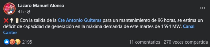 A través de sus redes sociales, el periodista oficialista Lázaro Manuel Alonso, citando a Canal Caribe, afirmó que la ‘Guiteras’ permanecerá desconectada del SEN por varios días, debido a labores de “mantenimiento” en su caldera.