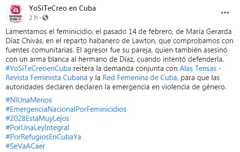 “Lamentamos el feminicidio, el pasado 14 de febrero, de María Gerarda Díaz Chivás, en el reparto habanero de Lawton, que comprobamos con fuentes comunitarias. El agresor fue su pareja, quien también asesinó con un arma blanca al hermano de Díaz, cuando intentó defenderla”, informó la organización.