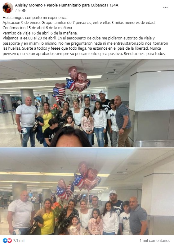 En esta ocasión, una ciudadana identificada como Anisley Moreno utilizó el grupo de Facebook ‘Parole Humanitario para Cubanos I-134A’ para explicar cómo siete miembros de su familia pudieron llegar a los Estados Unidos gracias al programa implementado por Joe Biden a inicios de 2023.