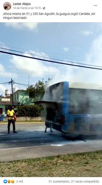 “Ahora mismo, en 51 y 250 San Agustín, la guagua cogió candela, sin ningún lesionado”, escribió en la breve publicación.