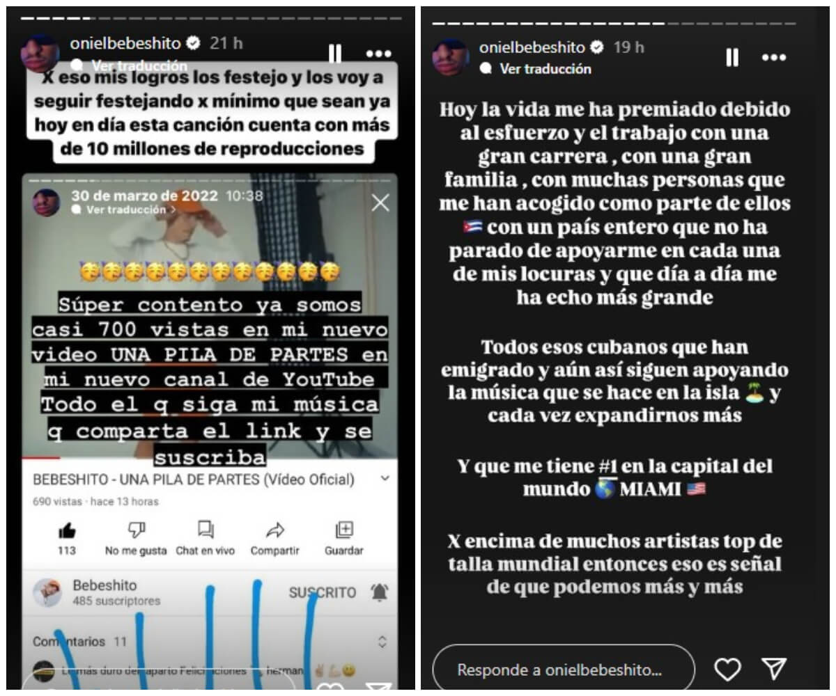 “Hoy estamos de aniversarios ya son tres añitos luchando por un sueño. Me acuerdo como si fuera hoy asere, yo me quedaba solito grabándome y haciéndome la música yo mismo en casa del Chino, en Habana Records, yendo desde tempranito a esperar que hubiera un huequito pa´ yo grabar, pasando hambre y vuelto de necesidades y por la noche empezar a grabar y después irme pa´ mi casa por la madrugada caminando desde Belascoain y Malecón hasta el Latino porque no tenía ni 40 centavos pa´ la guagua. Y hoy veo el resultado de tanto sacrificio y baf, no tengo palabras”, escribió el cantante en una publicación.