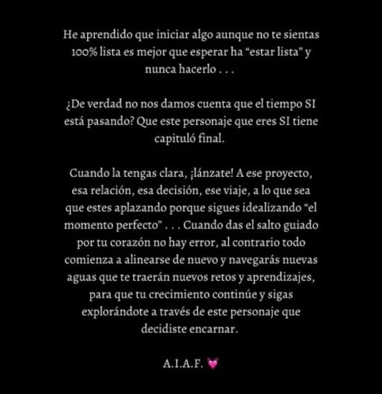 “He aprendido que iniciar algo, aunque no te sientas 100% lista, es mejor que esperar a ‘estar lista’ y nunca hacerlo (…) Cuando la tengas clara, ¡lánzate! A ese proyecto, a esa relación, a esa decisión, a lo que sea que estés aplazando porque sigues idealizando el ‘momento perfecto’”, escribió la esposa de Lyle.