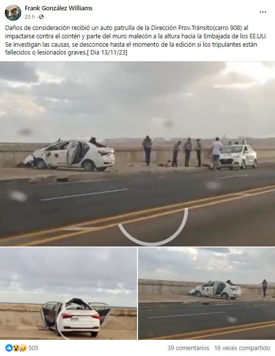 De acuerdo con el usuario Frank González Williams, el incidente se registró a la altura hacia la Embajada de EEUU en Cuba, y el vehículo, que pertenecía a la Dirección Provincial de Tránsito, terminó con daños “considerables”. Sin embargo, no se especificó si hubo lesionados o fallecidos.
