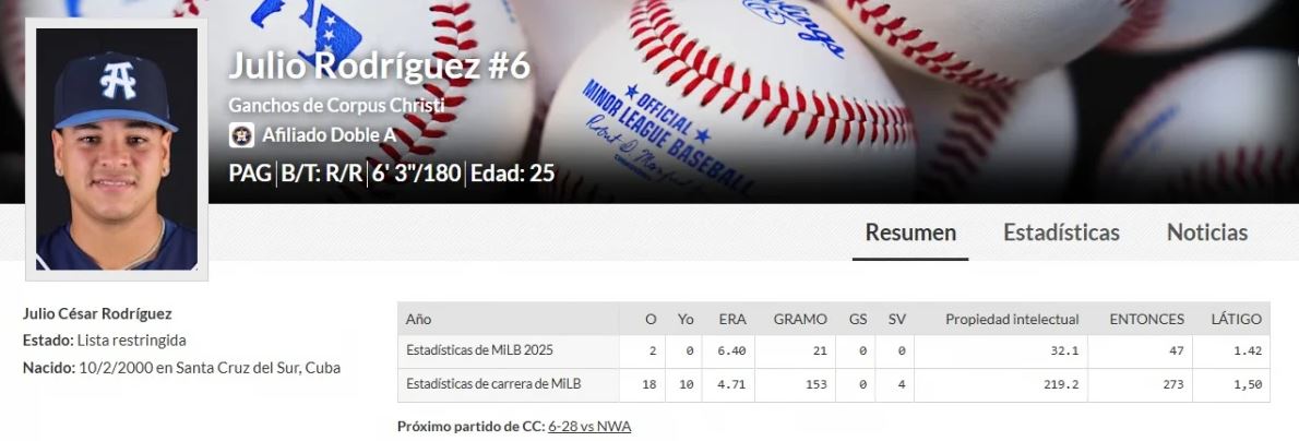 El jugador pertenece a los Corpus Christi Hooks, filial Doble A de los Astros de Houston, aunque esta temporada solo había lanzado 4.1 entradas en ese nivel. También tuvo participación en Clase A, con 28 entradas acumuladas.