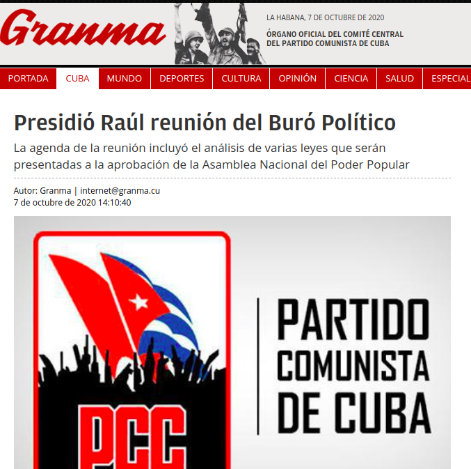 “Durante los días 6 y 7 de octubre sesionó el Buró Político del Comité Central del Partido Comunista de Cuba, presidido por su Primer Secretario, el General de Ejército Raúl Castro Ruz”, dijo una nota del periódico estatal Granma.