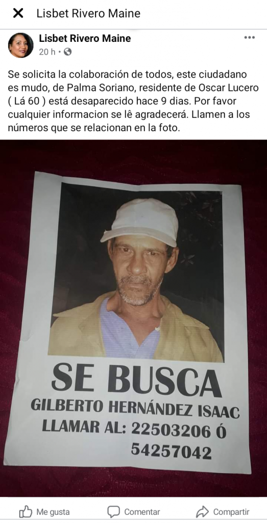 “Se solicita la colaboración de todos, este ciudadano es mudo, de Palma Soriano, residente de Oscar Lucero (La 60) está desaparecido hace 9 días. Por favor cualquier información se le agradecerá. Llamen a los números que se relacionan en la foto”, indicó la internauta.