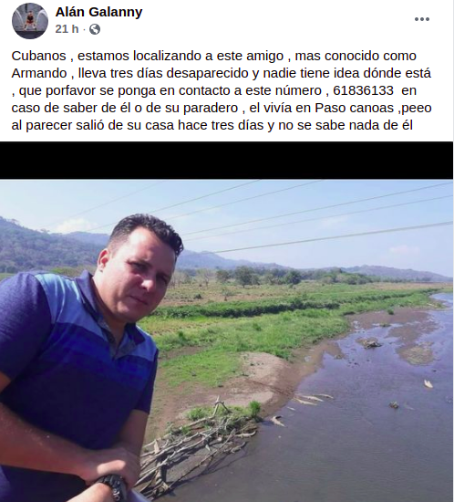 Así lo dio a conocer el internauta, Alán Galanny, quien a través de una publicación de Facebook explicó que el cubano que reside en la ciudad costarricense Paso Canoas, salió de su hogar hace unos tres días y desde entonces, no hay noticias acerca de su paradero.