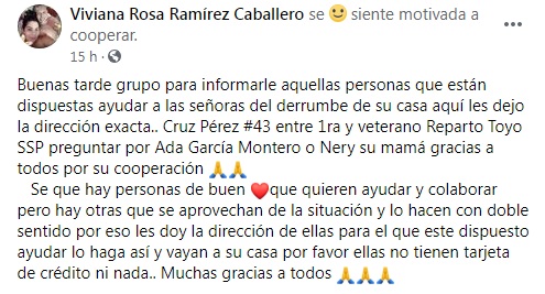 “Buenas tardes, grupo para informarle a aquellas personas que están dispuestas ayudar a las señoras del derrumbe de su casa aquí les dejo la dirección exacta: Cruz Pérez #43 entre 1.ª y veterano Reparto Toyo SSP, preguntar por Ada García Montero o Nery su mamá gracias a todos por su cooperación”, escribió la misma usuaria que informó del lamentable suceso.