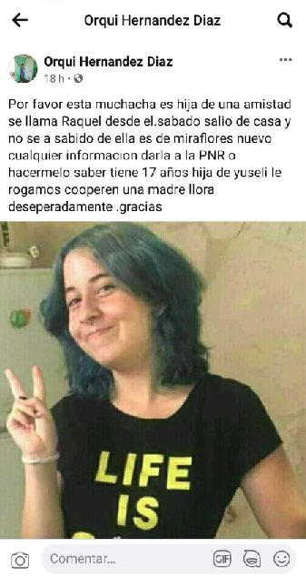 “Por favor esta muchacha es hija de una amistad se llama Raquel desde el sábado salió de casa y no se ha sabido de ella, es de Miraflores nuevo”, explicó Hernández Díaz en el post.