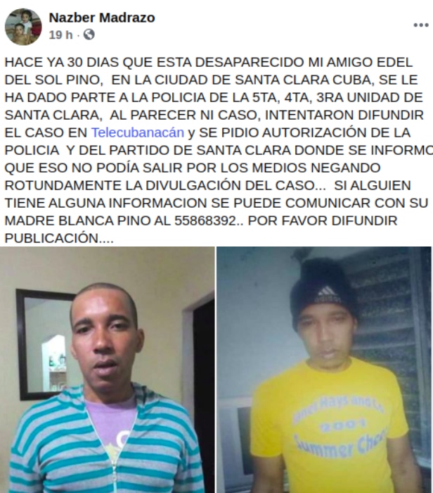 “Hace ya 30 días que está desaparecido mi amigo Edel del Sol Pino, en la ciudad de Santa Clara, Cuba”, explicó este usuario en su post.