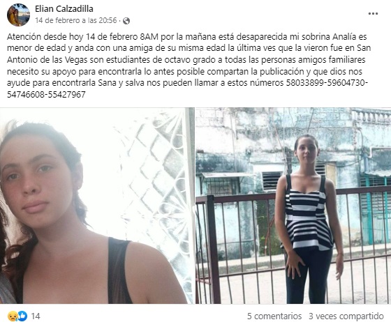 “Atención, desde hoy 14 de febrero 8:00 a.m. está desaparecida mi sobrina Analía, es menor de edad y anda con una amiga de su misma edad. La última vez que la vieron fue en San Antonio de las Vegas. Son estudiantes de octavo grado”, escribió el tío de la menor, Elian Calzadilla, en un grupo de compra y venta.