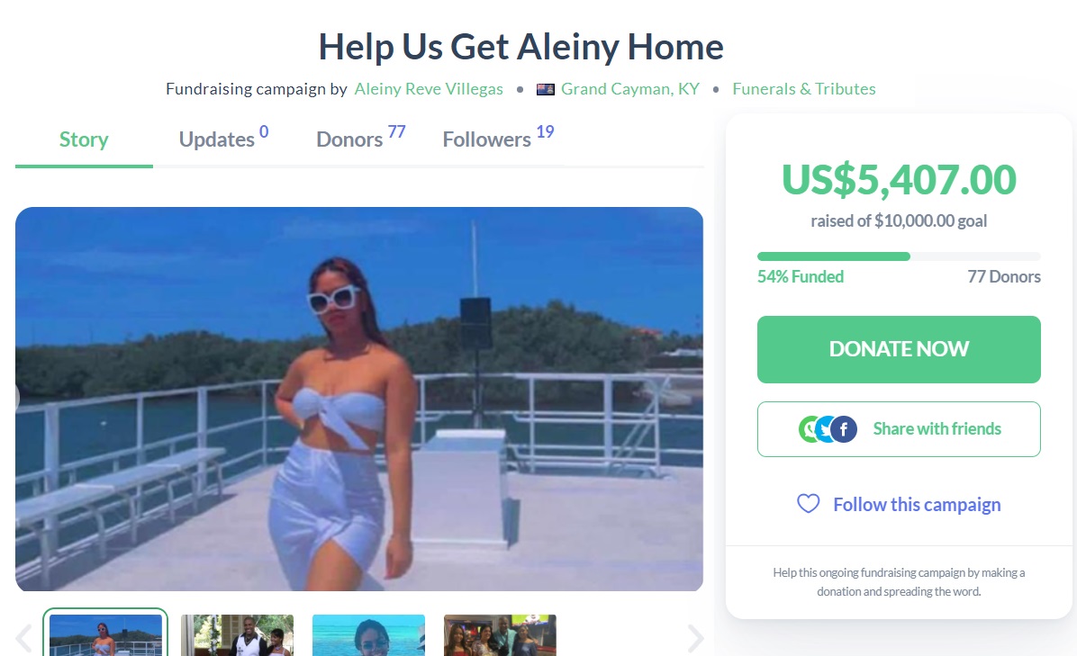 La familia de la fallecida, la cual indicó que la joven vivía en Georgetown y trabajaba en una tienda en Camana Bay, compartió información sobre la campaña, con la esperanza de reunir 10.000 dólares para cubrir los gastos de la repatriación y el funeral.