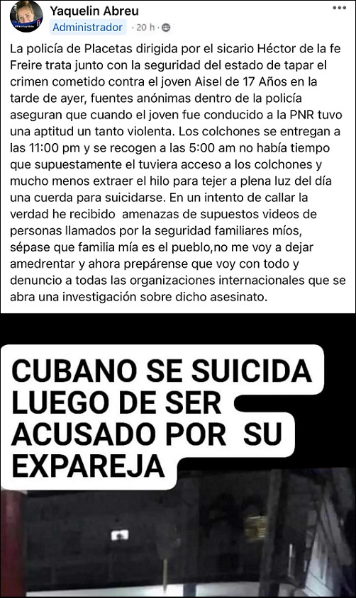 “La policía de Placetas, dirigida por el sicario Héctor de la Fe Freire, trata junto con la Seguridad del Estado de tapar el crimen cometido contra el joven Aisel, de 17 años, en la tarde de ayer”, escribió Abreu en redes sociales.