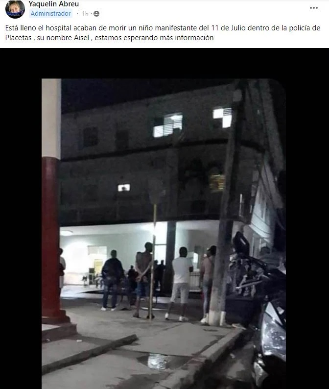 “Está lleno el hospital. Acaba de morir un niño manifestante del 11 de julio dentro de la policía de Placetas. Su nombre es Aisel. Estamos esperando más información”, indicó la denuncia inicial hecha en Facebook.