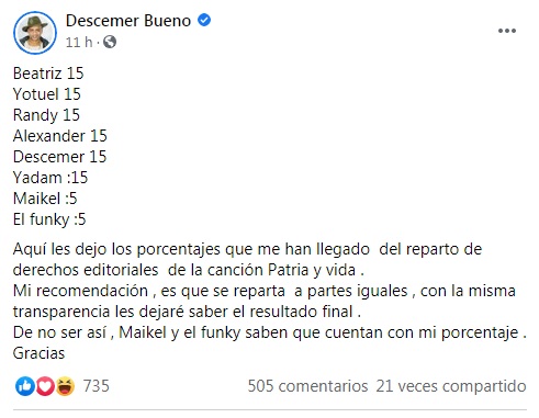 El cantautor cubano Descemer Bueno creó una polémica al publicar en sus redes sociales los porcentajes de ganancia que se han obtenido luego del lanzamiento del exitoso tema “Patria y Vida”.