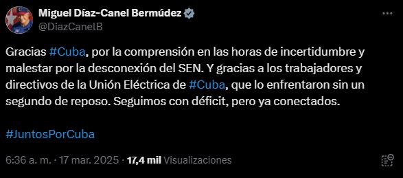 “Gracias Cuba, por la comprensión en las horas de incertidumbre y malestar por la desconexión del SEN. Y gracias a los trabajadores y directivos de la Unión Eléctrica de Cuba, que lo enfrentaron sin un segundo de reposo. Seguimos con déficit, pero ya conectados”, escribió el actual suegro de Ana de Armas en sus redes sociales.