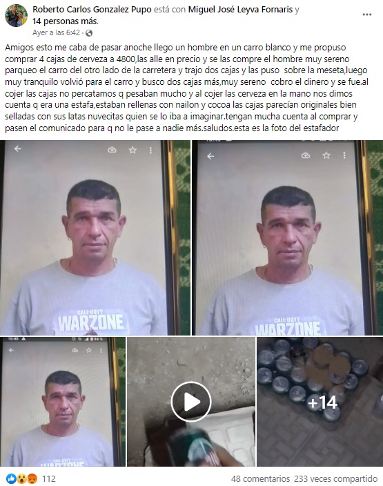 “Anoche llegó un hombre en un carro blanco y me propuso comprar cuatro cajas de cerveza a 4,800, las hallé en precio y se las compré”, se lee en la publicación de Facebook.
