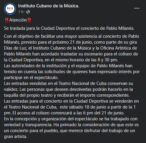 A través de un comunicado en su página oficial de Facebook, el Instituto Cubano de la Música anunció la iniciativa, a la vez que defendió que, supuestamente, sí prioriza los intereses de la población.