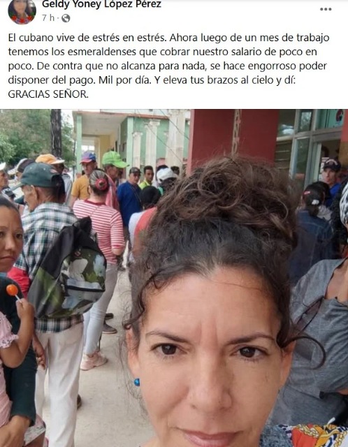 A través de su cuenta de Facebook, Geldy Yoney López Pérez explicó que, tras un mes de trabajo, los habitantes de Esmeralda ahora deben cobrar sus sueldos “en pequeñas cantidades”, debido a la escasez de efectivo en los bancos del régimen.
