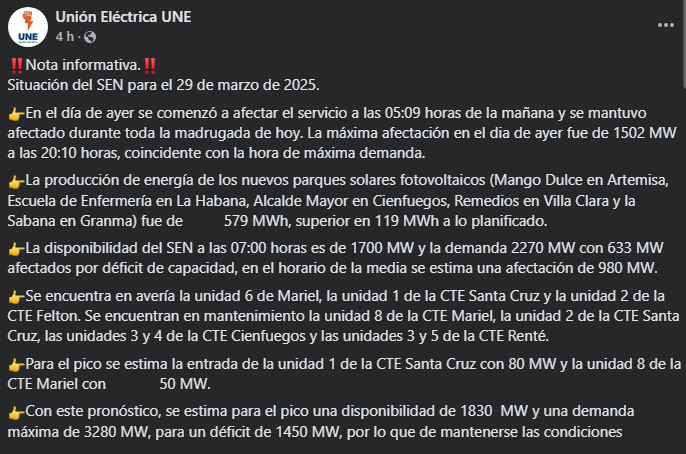 La crisis eléctrica en Cuba continúa, con un déficit de generación de más de 1.500 MW esperado para la hora pico de este viernes 4 de abril.