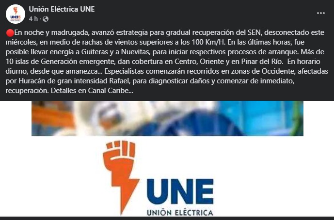 Luego del paso de Rafael como huracán categoría 3 por el occidente del país, el régimen de Cuba comenzó con la aplicación de medidas para intentar recuperar de forma gradual el Sistema Eléctrico Nacional (SEN), que desconectó por completo la tarde de este 6 de noviembre.