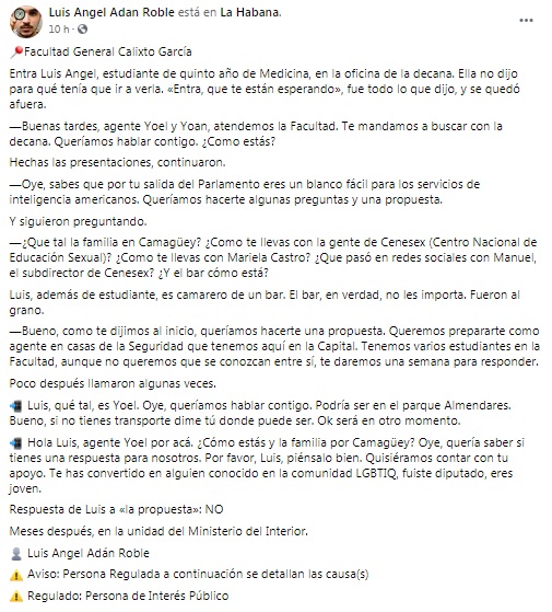 Adán Roble que defiende los derechos de la comunidad LGBTIQ se negó a formar parte de la seguridad del castrismo respondiendo con un “No” a la persecución de la que fue víctima, sin embargo contó que posteriormente a esto, ante el Ministerio de Interior aparece como una persona “regulada”.
