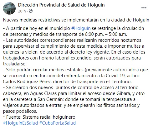 Restricción de movimiento en Holguín de 8pm a 5am ante crisis sanitaria. (Captura de pantalla: Dirección Provincial de Salud de Holguín – Facebook)