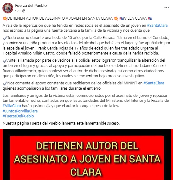 “Los familiares y amigos de la víctima están conmocionados por el asesinato del joven y repudian tan lamentable hecho, confiados en que las autoridades del Ministerio del Interior y la Fiscalía de Villa Clara harán justicia y que el autor le caiga el peso de la ley”, finaliza la publicación.